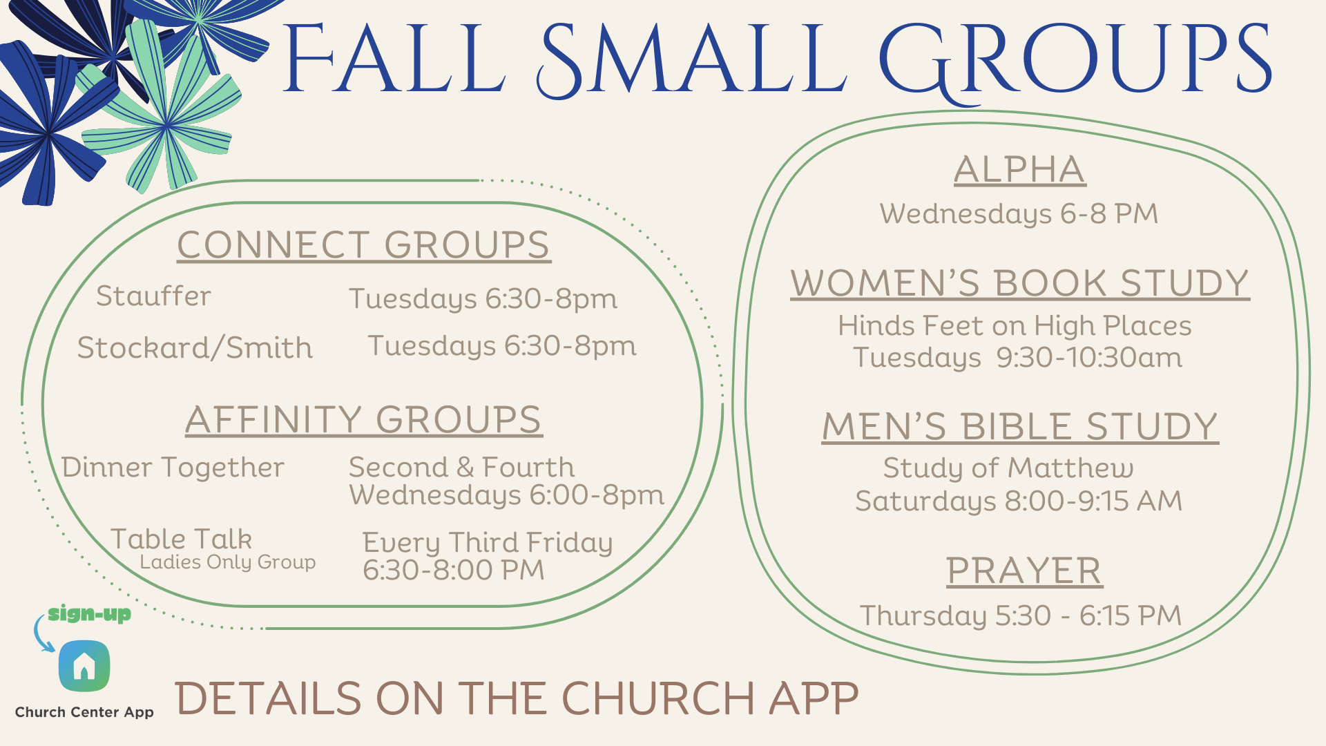There are a variety of small group options for those wanting to connect with others in addition to Sunday mornings.